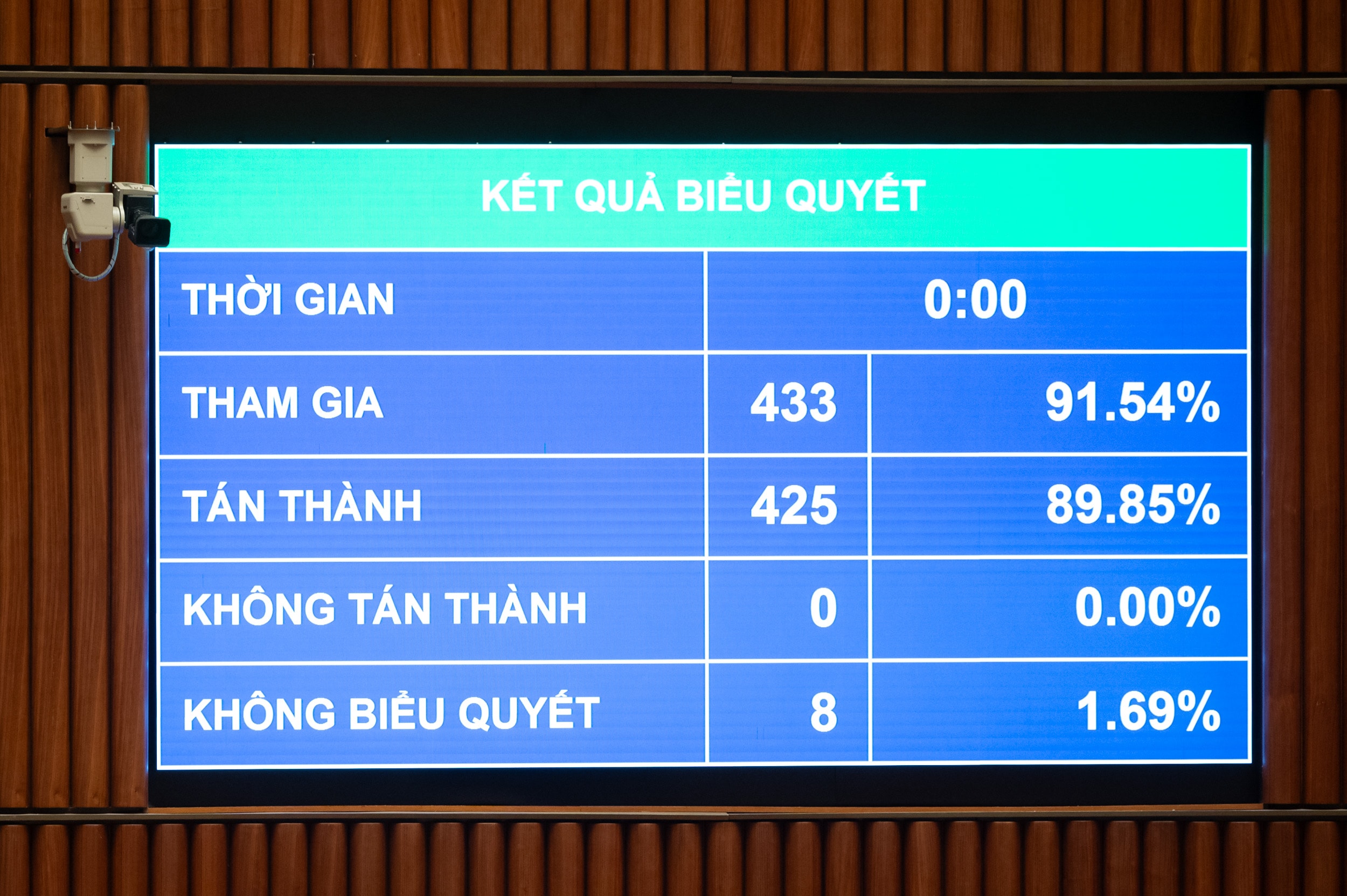 Quốc hội biểu quyết thông qua Luật sửa đổi, bổ sung một số điều của 10 luật có liên quan đến an ninh, trật tự với 425/433 ĐBQH có mặt tán thành. Ảnh: Phạm Thắng
