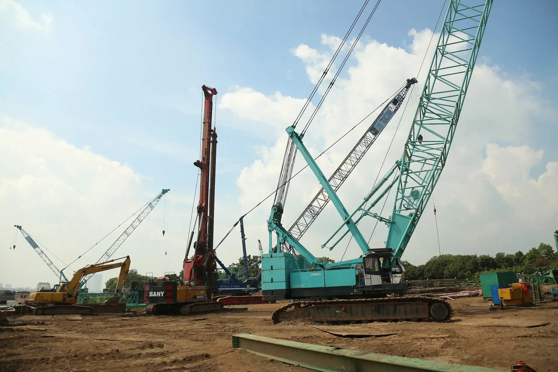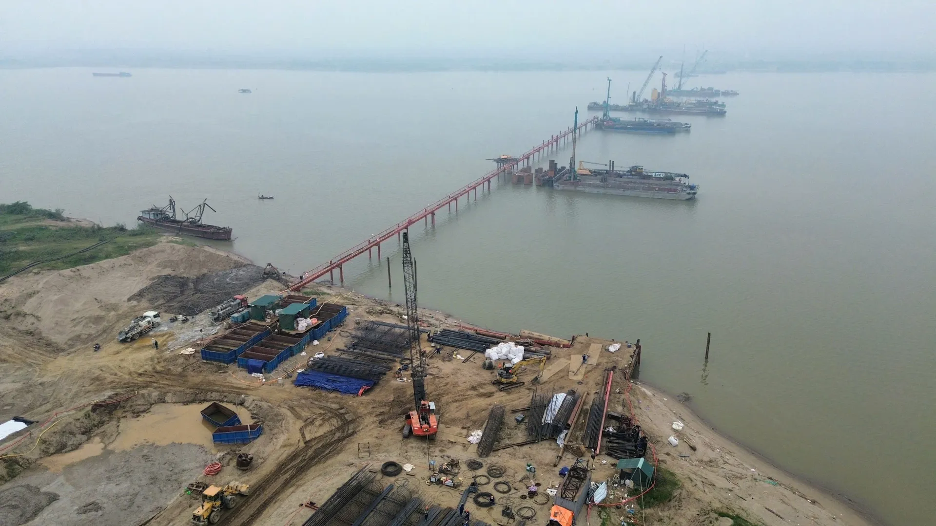 Toàn cảnh công trường thi công cầu Mễ Sở ở khu vực ven sông Hồng