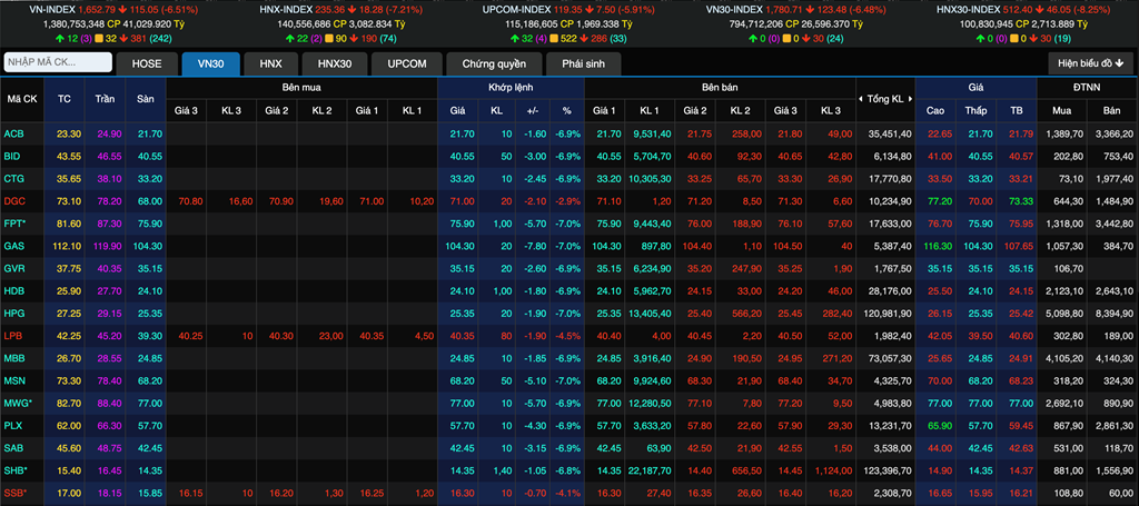 Kết thúc ngày đầu tiên của tuần giao dịch, VN-Index giảm hơn 115 điểm (tương đương giảm 6,51%) xuống còn 1.652,79 điểm, trong khi thanh khoản vẫn duy trì ở mức cao với khối lượng giao dịch trên sàn HoSE đạt hơn 1,38 triệu cổ phiếu và giá trị giao dịch hơn 41.029 tỷ đồng.