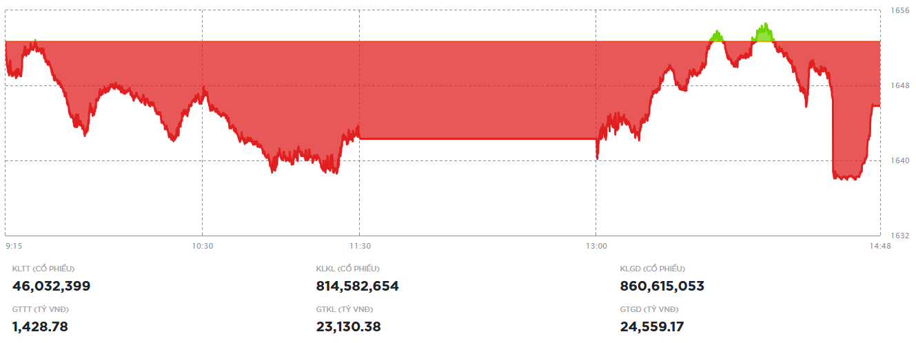 Đóng cửa, sàn HOSE có 85 mã tăng và 229 mã giảm, VN-Index giảm 6,89 điểm (-0,42%), xuống 1.645,82 điểm. Tổng khối lượng giao dịch đạt hơn 860,6 triệu đơn vị, giá trị 24.559,2 tỷ đồng, tăng hơn 10% về khối lượng và 8% về giá trị so với phiên hôm qua. Giao dịch thỏa thuận đóng góp hơn 35,1 triệu đơn vị, giá trị 1.396 tỷ đồng.
