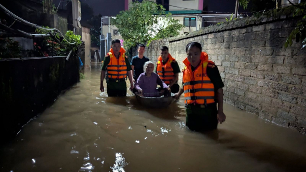 Xúc động hình ảnh các cán bộ, chiến sỹ Công an đưa người dân đến nơi an toàn trong mưa lũ.