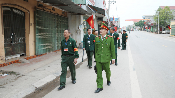 Cán bộ Công an và lực lượng bảo đảm an ninh, trật tự ở cơ sở tuần tra bảo vệ sự bình yên cho người dân.