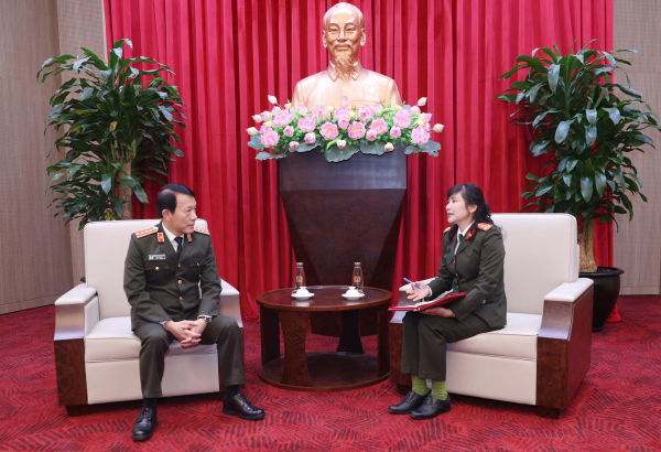 Đại tướng Lương Tam Quang, Ủy viên Bộ Chính trị, Bí thư Đảng ủy Công an Trung ương, Bộ trưởng Bộ Công an trả lời phỏng vấn. (Ảnh: Khổng Hà)
