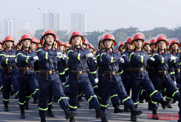Khối sĩ quan Cảnh sát PCCC và CNCH duyệt đội ngũ tại buổi tổng duyệt. Thông qua hoạt động lần này, toàn lực lượng có dịp rà soát, kiểm tra toàn diện hệ thống phương tiện, trang thiết bị kỹ thuật và công cụ hỗ trợ, đảm bảo trạng thái sẵn sàng chiến đấu cao nhất trong mọi tình huống.