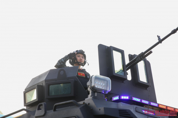 Nữ chiến sĩ CAND chào nghiêm trang từ một phương tiện bọc thép hiện đại. Dự kiến, Lễ xuất quân và diễn tập các phương án bảo vệ an ninh, trật tự phục vụ Đại hội đại biểu toàn quốc lần thứ XIV của Đảng, sẽ diễn ra sáng 10/1/2025 tại Hà Nội.
