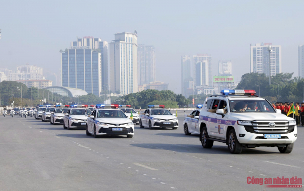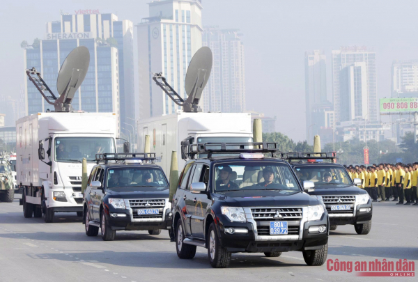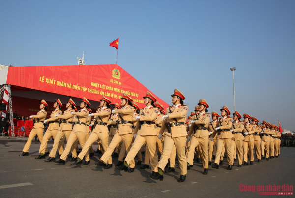 Sau đó, các lực lượng tham gia bảo vệ Đại hội XIV của Đảng đã duyệt đội ngũ, diễu hành phương tiện, thiết bị kỹ thuật và các nội dung khác theo kế hoạch đề ra. Dẫn đầu đội hình duyệt đội ngũ là Tổ Công an kỳ, mang theo lá cờ truyền thống vẻ vang “Vì an ninh Tổ quốc” của lực lượng CAND Anh hùng.