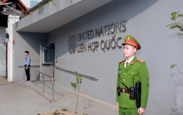 Trung úy Lê Đức Thành Nam làm nhiệm vụ vũ trang canh gác bảo vệ mục tiêu Trụ sở các tổ chức của Liên hợp quốc.