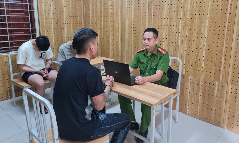 Cán bộ Phòng Cảnh sát hình sự lấy lời khai của các đối tượng trong vụ gây rối trật tự công cộng.