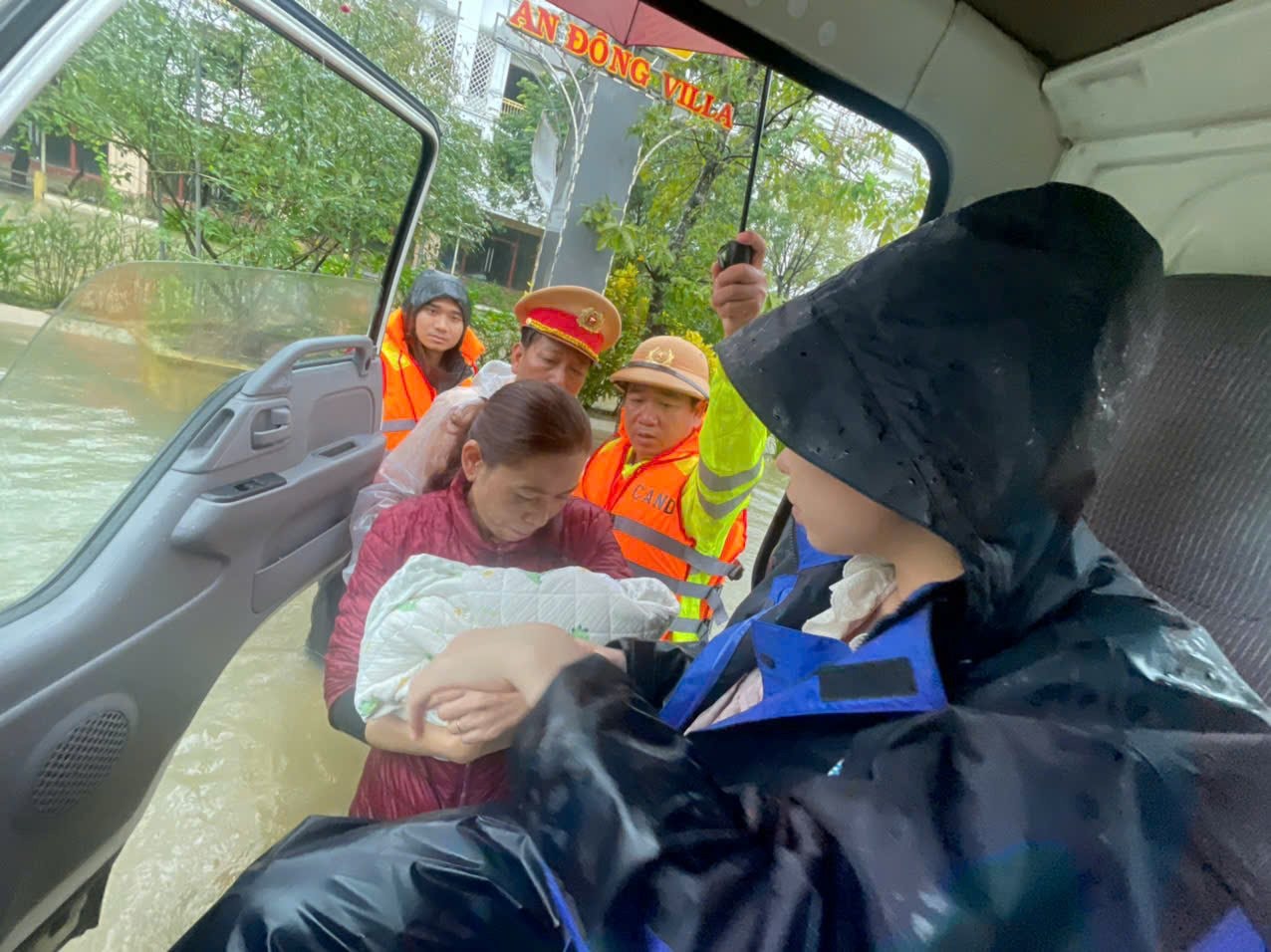 Chị Hồ Hoàng Thi (SN 2007, trú tổ dân phố Vỹ La, phường An Đông, TP Huế) – vừa sinh con được 7 ngày tuổi. Khi nước lũ dâng cao gần 80cm, gia đình không có phương tiện di chuyển nên đã nhờ lực lượng Công an hỗ trợ.