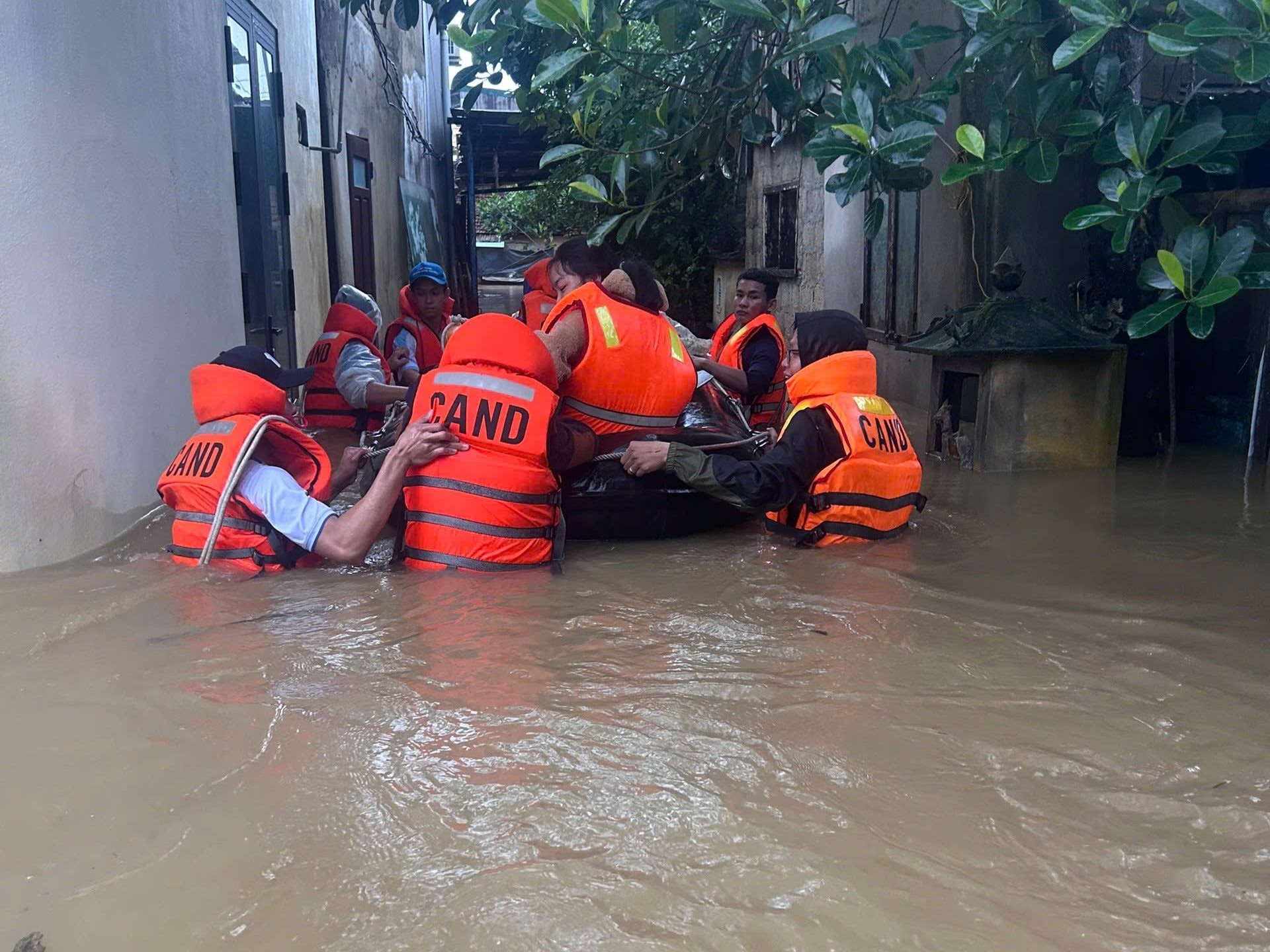 Tại TP Huế, mưa lớn khiến nhiều khu vực như phường An Cựu, Vỹ Dạ, Thuận Hóa… bị ngập sâu. Phòng Cảnh sát PCCC và CNCH (PC07) đã phối hợp cùng Công an phường Vỹ Dạ dùng xuồng máy đưa người già và hai trẻ nhỏ đến khu vực an toàn, tránh ngập sâu.