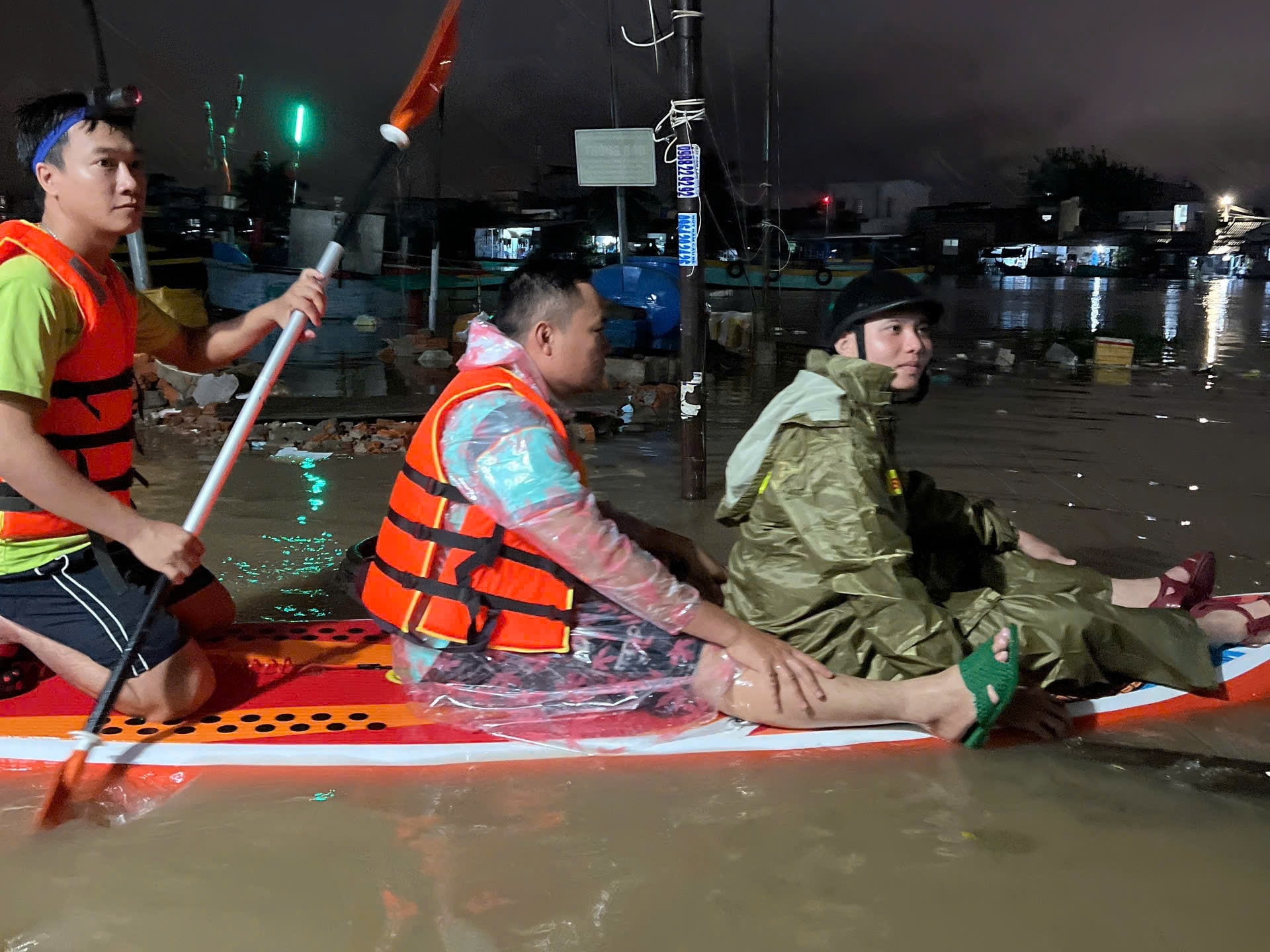 Các lực lượng tại phường Phan Thiết đang hỗ trợ người dân khu vực ven sông Cà Ty bị ngập đến nơi an toàn