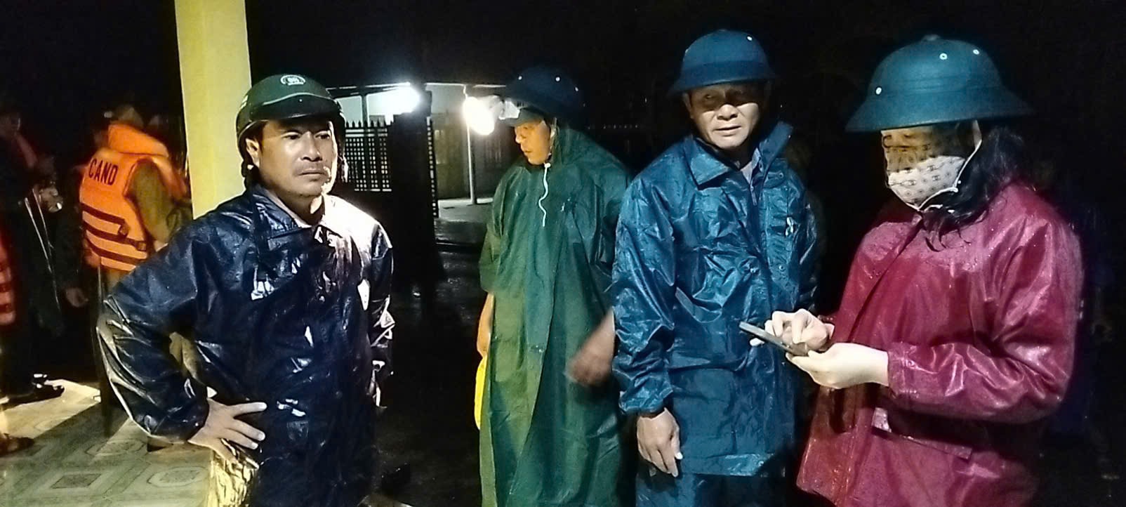 Trong đêm 27/10, Bí thư Đảng ủy xã Hàm Liêm Nguyễn Thị Toàn Thắng (áo đỏ) có mặt tại khu vực các hộ dân bị ảnh hưởng do ngập lụt.