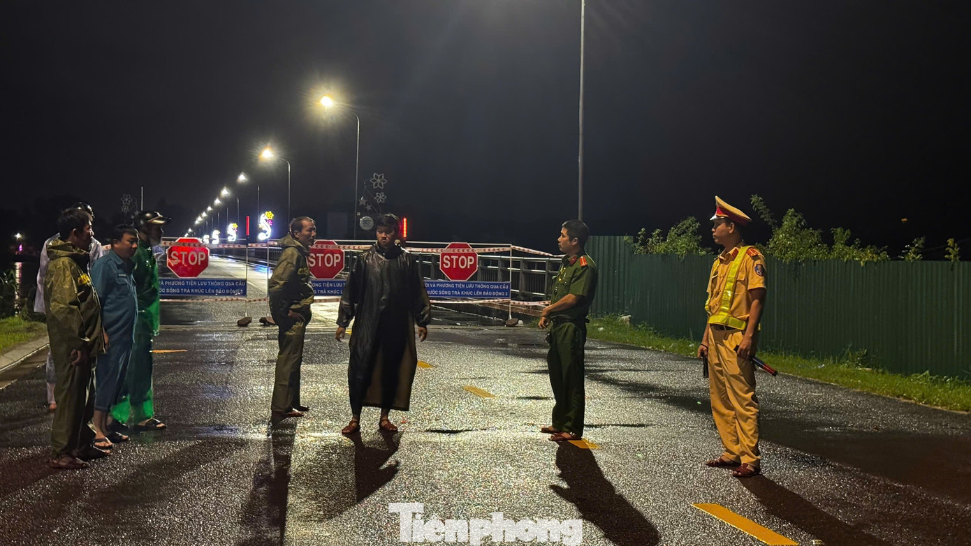 Đến 22h ngày 29/10, nước lũ trên sông Trà Bồng và Trà Khúc (tỉnh Quảng Ngãi) đã rút chậm nhưng vẫn duy trì trên báo động 3. Lực lượng công an, dân phòng dầm mưa chốt chặn, xuyên đêm điều tiết giao thông trên các tuyến giao thông.