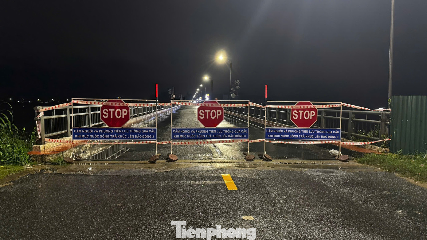 Lực lượng chức năng giăng dây cấm phương tiện lưu thông qua cầu Châu Ổ.