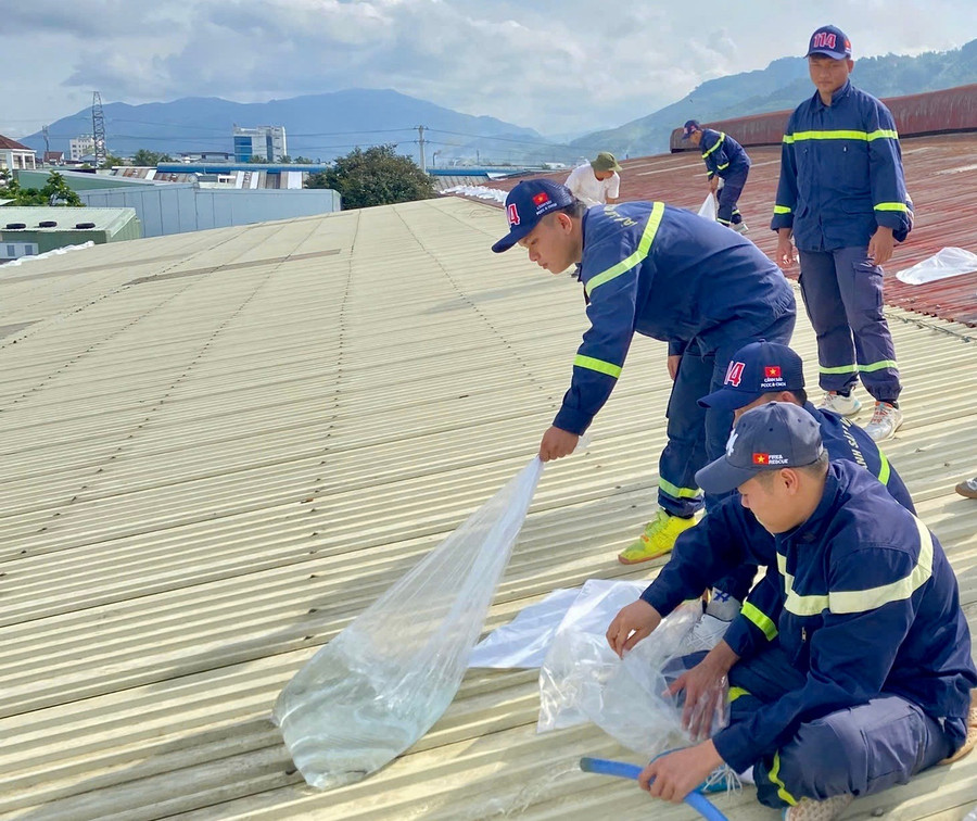 Tại hiện trường, lực lượng Cảnh sát PCCC & CNCH đã hướng dẫn, giúp các doanh nghiệp gia cố mái tôn, chằng chống nhà xưởng, kiểm tra hệ thống điện, sắp xếp lại vật tư dễ cháy nổ để phòng ngừa sự cố trong mưa bão.