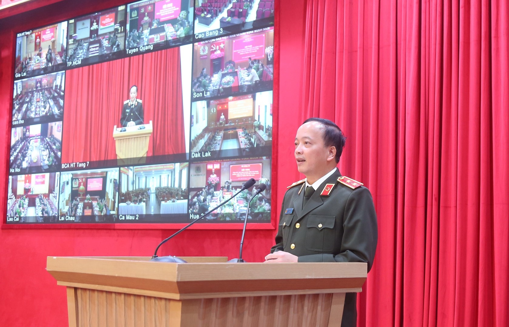Phó Chánh Văn phòng Bộ Công an, Phó Trưởng Ban Thường trực Ban Chỉ huy Phòng thủ dân sự Bộ Công an Thiếu tướng Nguyễn Hồng Nguyên, trình bày Báo cáo tại Hội nghị.