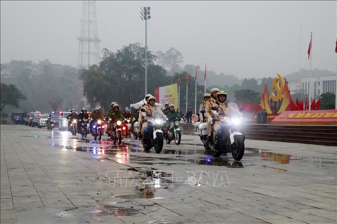 Các lực lượng nghiệp vụ Công an tỉnh Lào Cai diễu hành biểu dương lực lượng trên các tuyến đường. Ảnh: Đinh Thùy/TTXVN