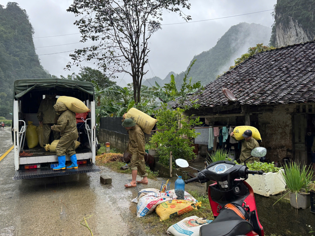 Công an xã Độc Lập giúp dân chuyển ngô, thóc lên cao tránh ngập.