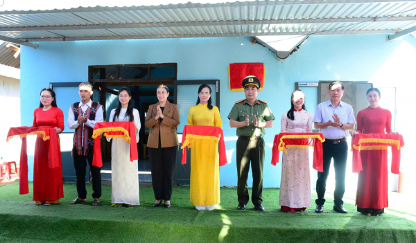 Thiếu tướng Hồ Song Ân, Giám đốc Công an tỉnh Quảng Ngãi cùng đồng chí Đỗ Tâm Hiển, Phó Chủ tịch UBND tỉnh Quảng Ngãi, đại diện các cơ quan, ban ngành thực hiện nghi lễ cắt băng khánh thành và bàn giao nhà cho hộ gia đình ông Đinh Văn Quân (thôn Gò Rô, xã Tây Trà).