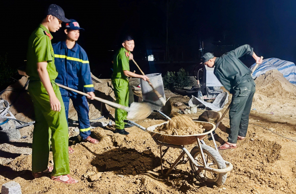 Cán bộ, chiến sĩ Công an tỉnh Gia Lai nỗ lực xây nhà ban đêm tại xã Đề Gi.