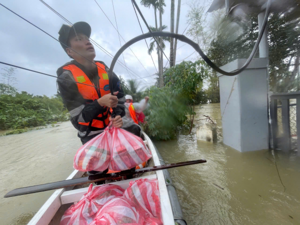 Các chiến sĩ câu dây, buộc chặt túi hàng nhu yếu phẩm chuyển cho người dân trong thôn đang bị nước lũ cô lập tại xã Hòa Tiến.