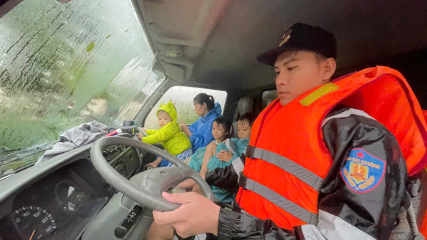 "Ngồi vững nào, để chú Công an, Cảnh sát Cơ động đưa các cháu vượt qua đoạn lũ xiết".