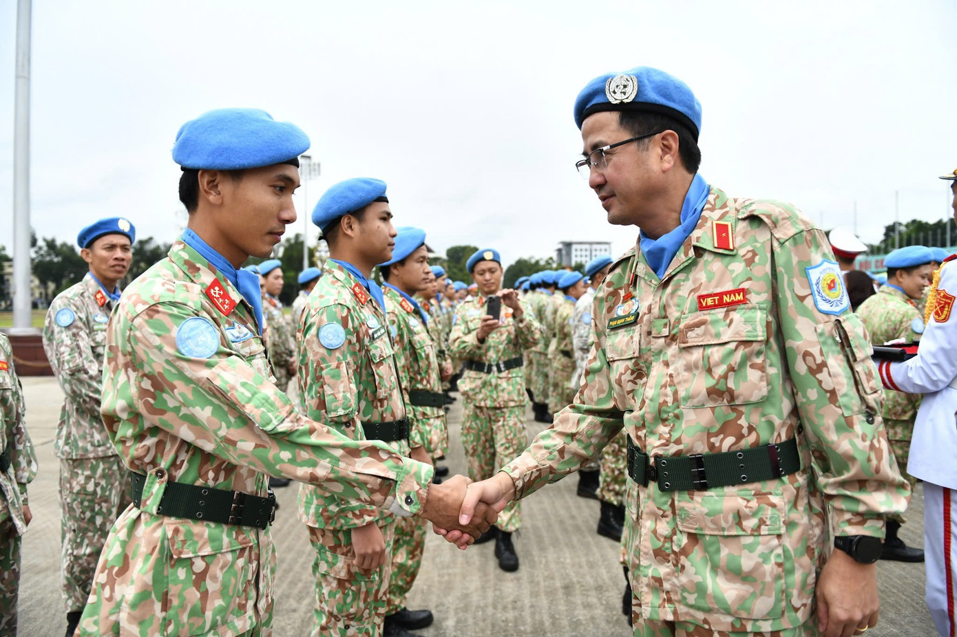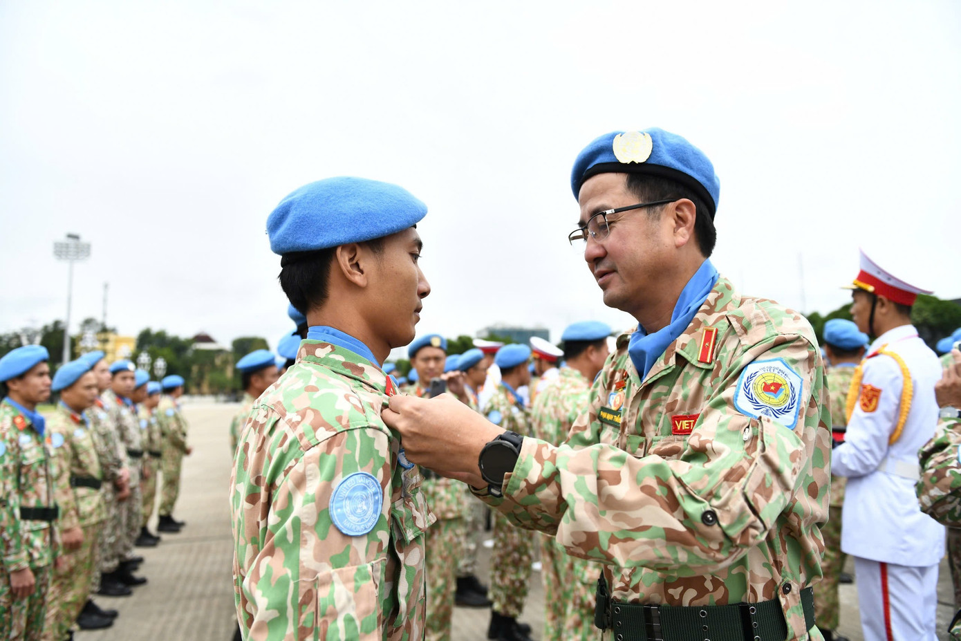 Thiếu tướng Phạm Mạnh Thắng - Cục trưởng Cục Gìn giữ hòa bình Việt Nam, trao Huy hiệu Bác Hồ tặng các cán bộ, chiến sĩ mũ nồi xanh trong khuôn khổ Lễ báo công.