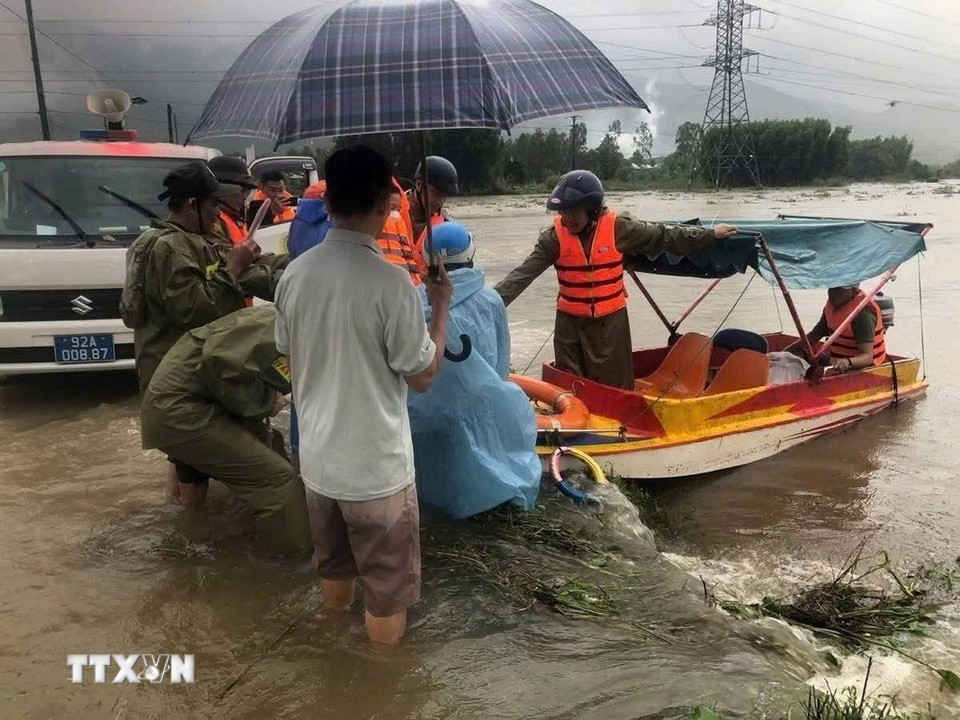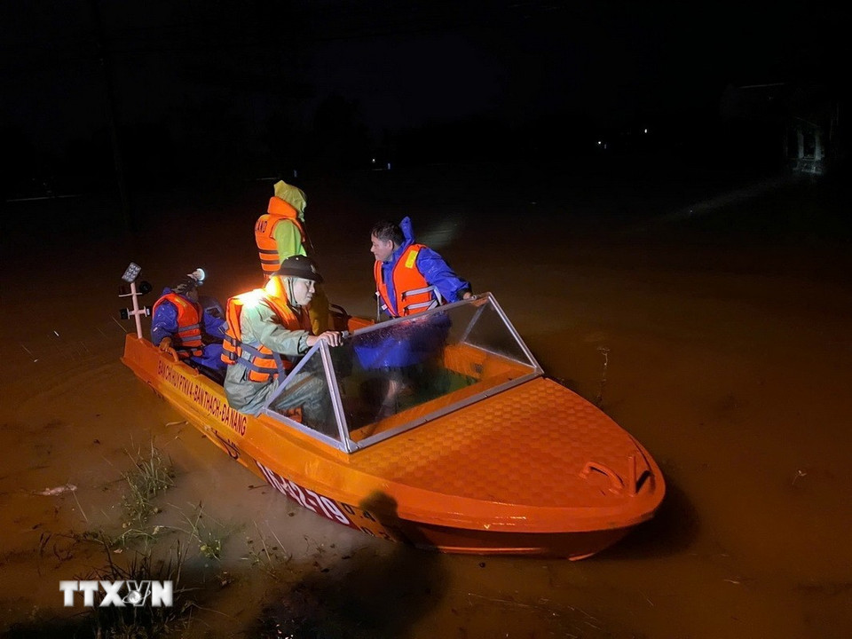 Lực lượng vũ trang thành phố Đà Nẵng hỗ trợ người dân tại một điểm ngập lụt. (Ảnh: TTXVN phát)