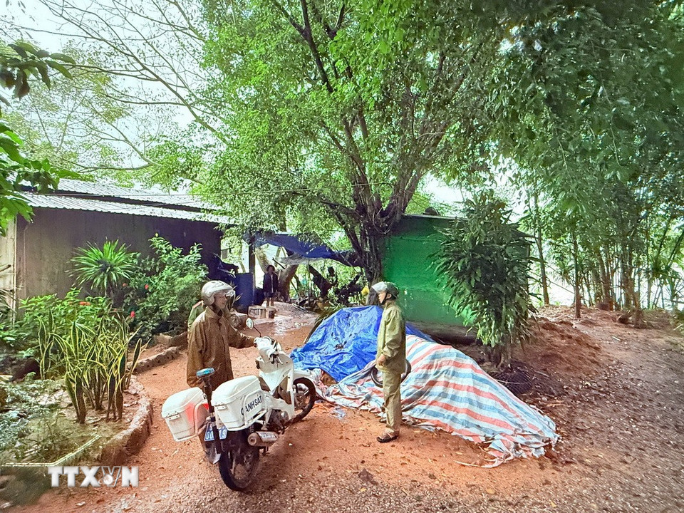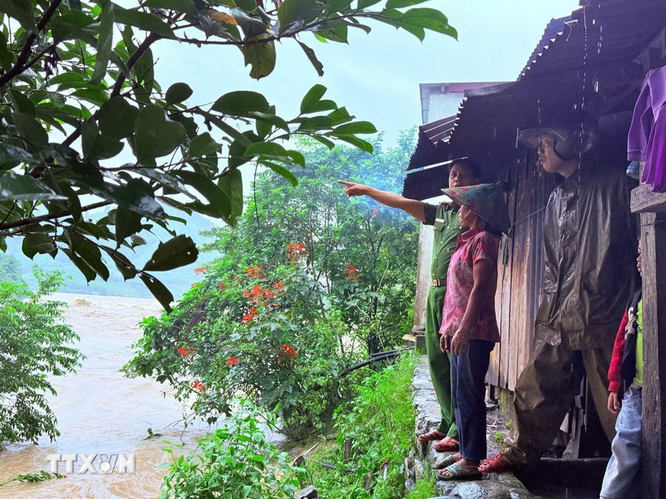 Công an xã Bến Giằng (thành phố Đà Nẵng) đi từng nhà để hỗ trợ người dân mùa mưa lũ. (Ảnh: TTXVN phát)