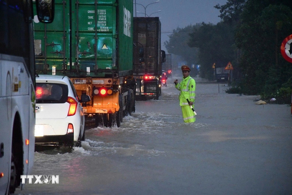 Lực lượng Công an thành phố Đà Nẵng được huy động 100% quân số túc trực tại những điểm ngập lụt, sạt lở để đảm bảo an toàn cho người dân. (Ảnh: TTXVN phát)