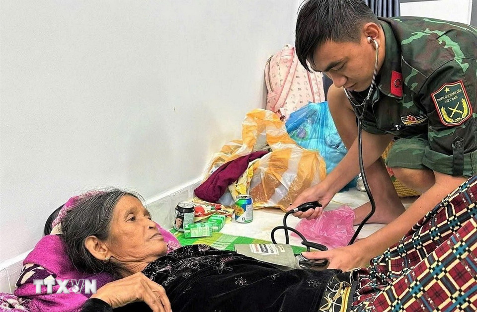 Lực lượng vũ trang thành phố Đà Nẵng kiểm tra sức khỏe cho người dân tại một điểm sơ tán tránh lũ. (Ảnh: TTXVN phát)