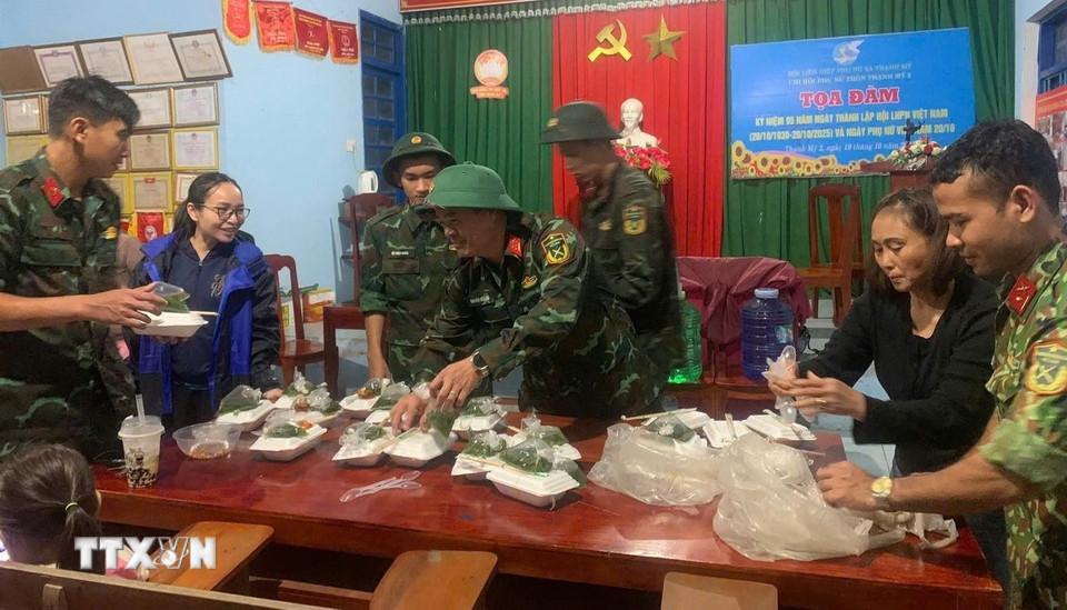 Lực lượng vũ trang thành phố Đà Nẵng hỗ trợ lương thực cho người dân tại một điểm sơ tán tránh lũ. (Ảnh: TTXVN phát)