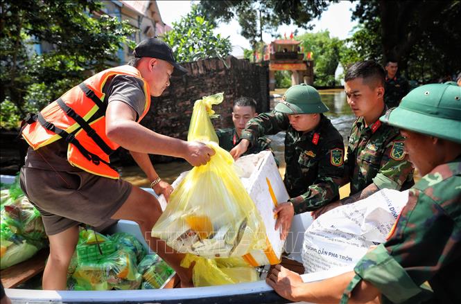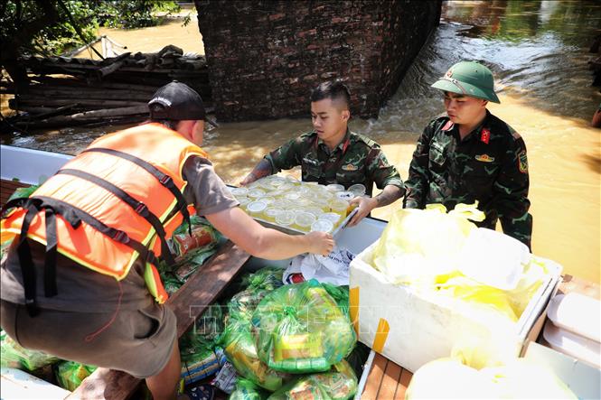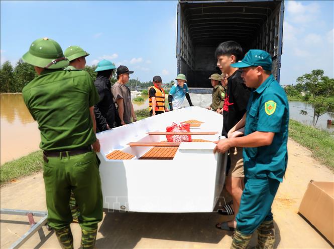Các lực lượng vũ trang mang xuồng cứu hộ để hỗ trợ người dân. Ảnh: Danh Lam/TTXVN