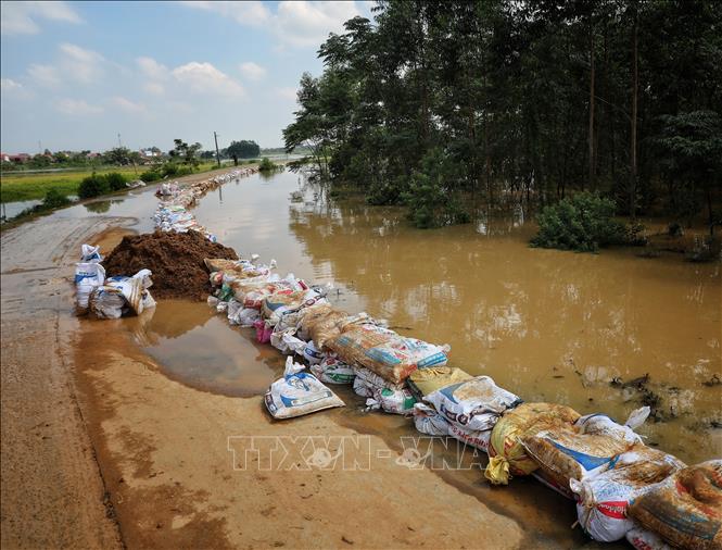 Cán bộ chiến sỹ Sư đoàn 3 (Quân khu 1) khẩn trương gia cố đê tại thôn Phú Cốc, xã Hợp Thịnh. Ảnh: Danh Lam -TTXVN