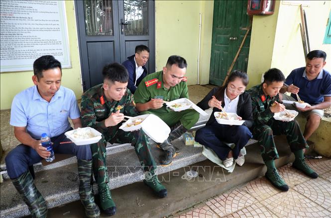 Cán bộ chiến sỹ Sư đoàn 3 (Quân khu 1) hỗ trợ vận chuyển hàng tiếp tế cho người dân tại thôn Phú Cốc, xã Hợp Thịnh. Ảnh: Danh Lam/TTXVN