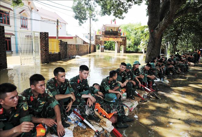 Cán bộ chiến sỹ Sư đoàn 3 (Quân khu 1) khẩn trương gia cố đê tại thôn Phú Cốc, xã Hợp Thịnh. Ảnh: Danh Lam/TTXVN