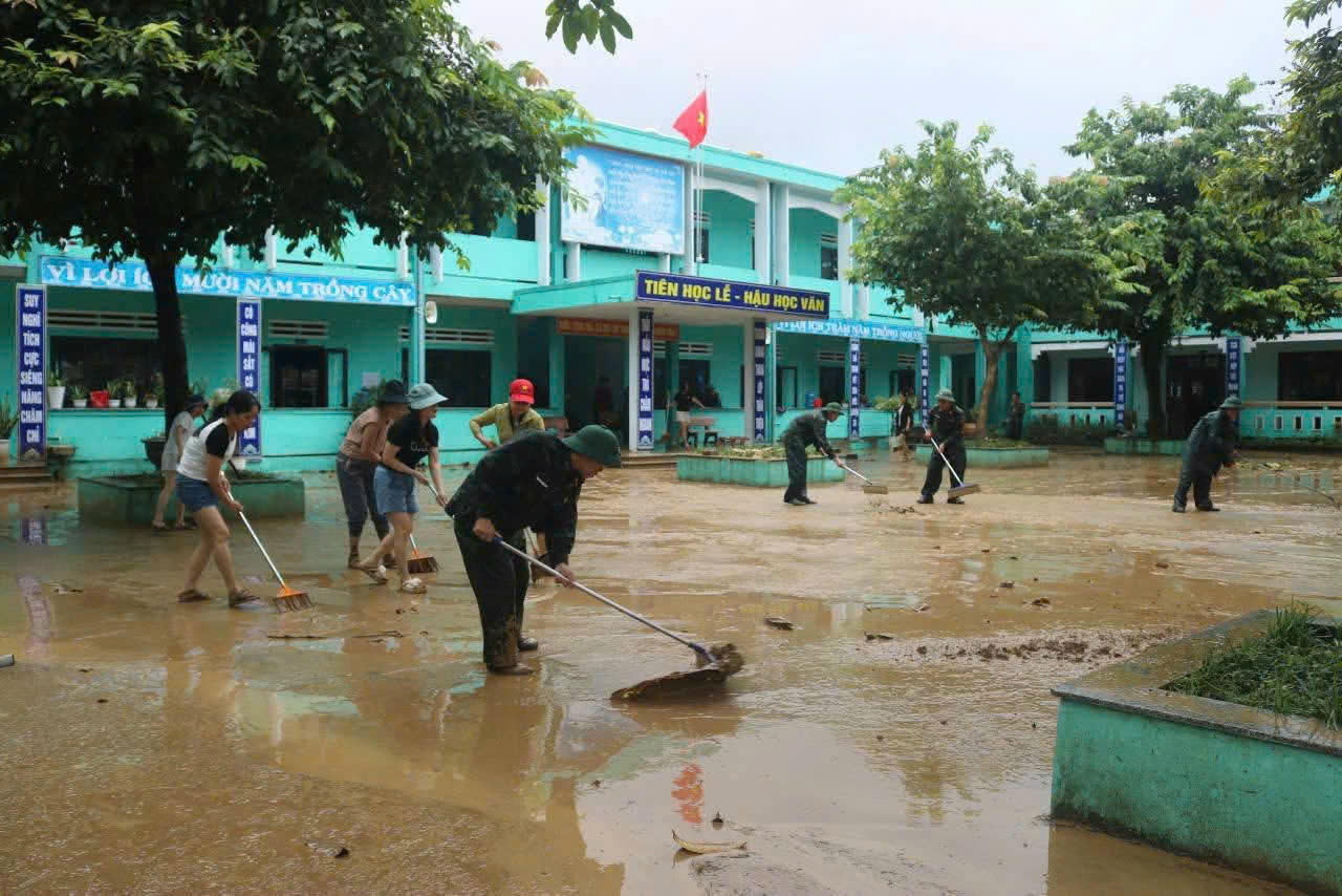 Tại xã Đại Lộc - nơi chịu ảnh hưởng nặng nề trong đợt mưa lũ vừa qua, hàng chục cán bộ, chiến sĩ miệt mài làm việc suốt buổi sáng. Trong những dãy phòng học còn ám mùi bùn ẩm, người lính và giáo viên cùng nhau lau chùi bàn ghế, cọ rửa nền lớp, sắp lại bàn học cho ngay ngắn.