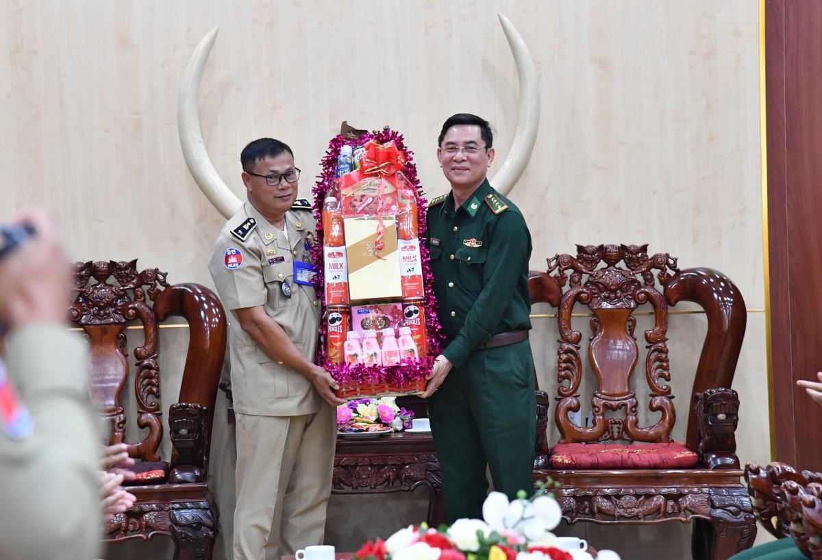 Thiếu tướng Sau Sa Vat, Phó giám đốc Ty Công an tỉnh Mondulkiri (Campuchia) tặng quà và chúc mừng năm mới Ban Chỉ huy Bộ đội Biên phòng tỉnh Đắk Lắk. Ảnh: Ngọc Lân
