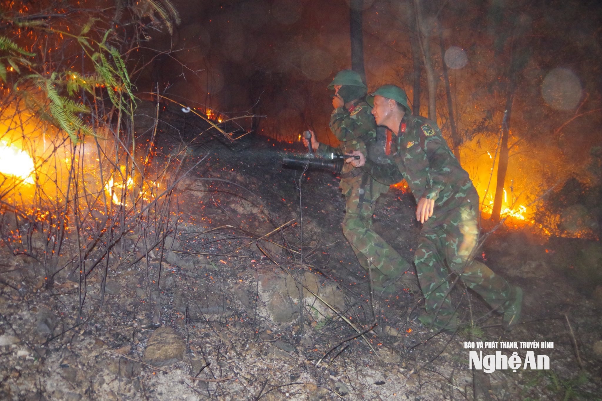 LLVT Quân khu 4 tham gia chữa cháy rừng. Ảnh: Ngọc Thăng