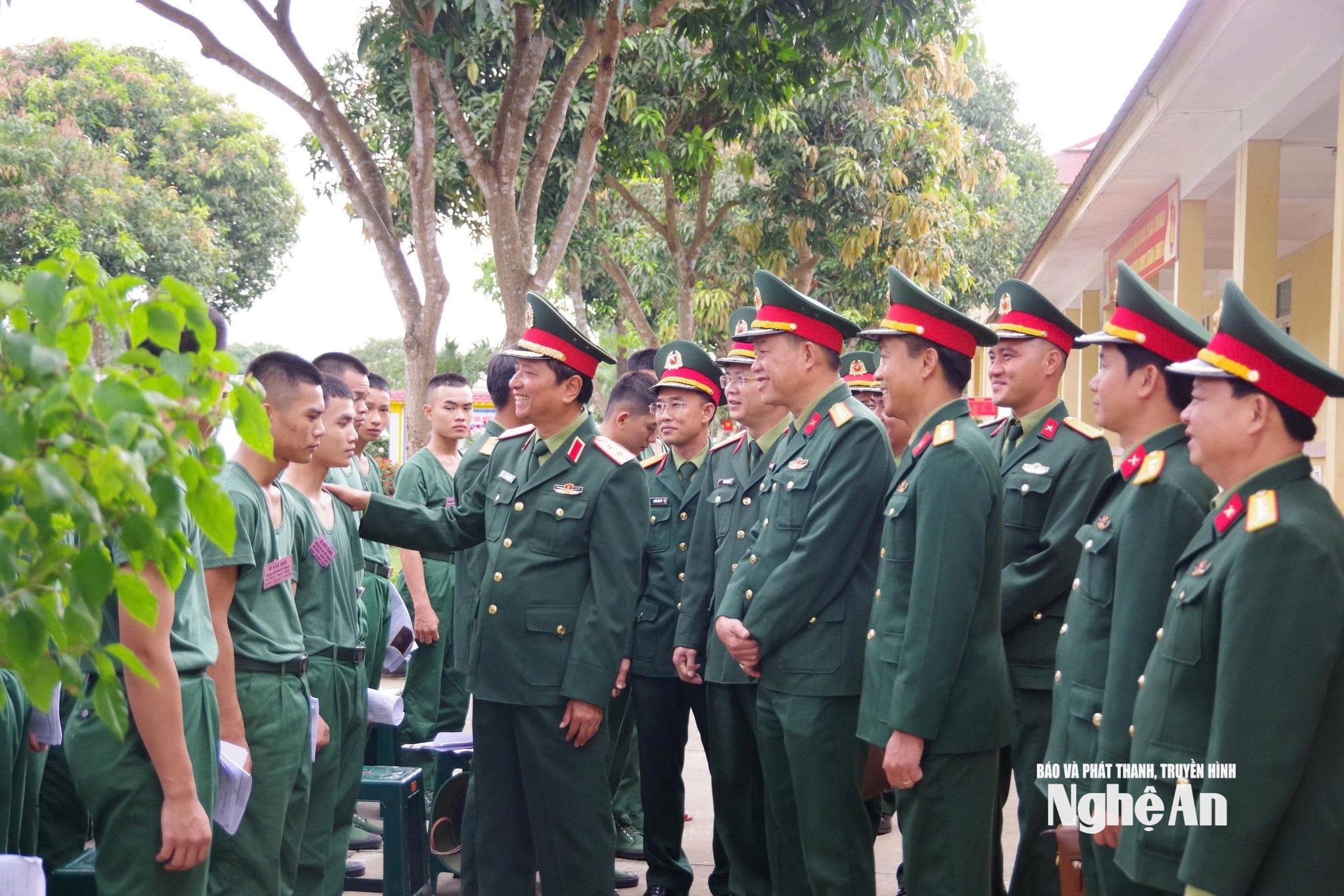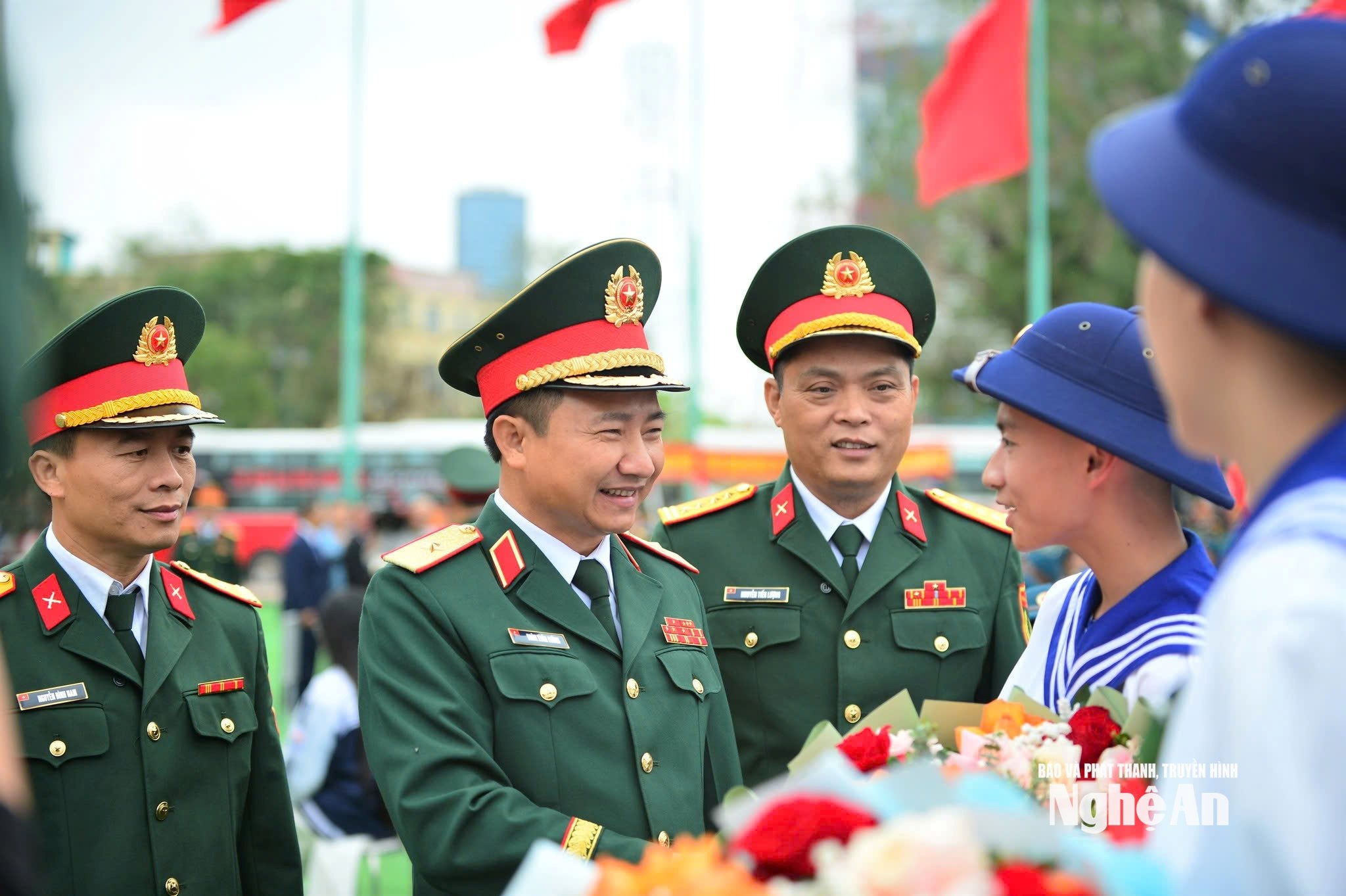Thiếu tướng Đoàn Xuân Bường - Ủy viên Ban Chấp hành Trung ương Đảng, Bí thư Đảng ủy, Chính ủy Quân khu 4 tặng hoa động viên thanh niên Nghệ An lên đường nhập ngũ. Ảnh: Hoàng Thái