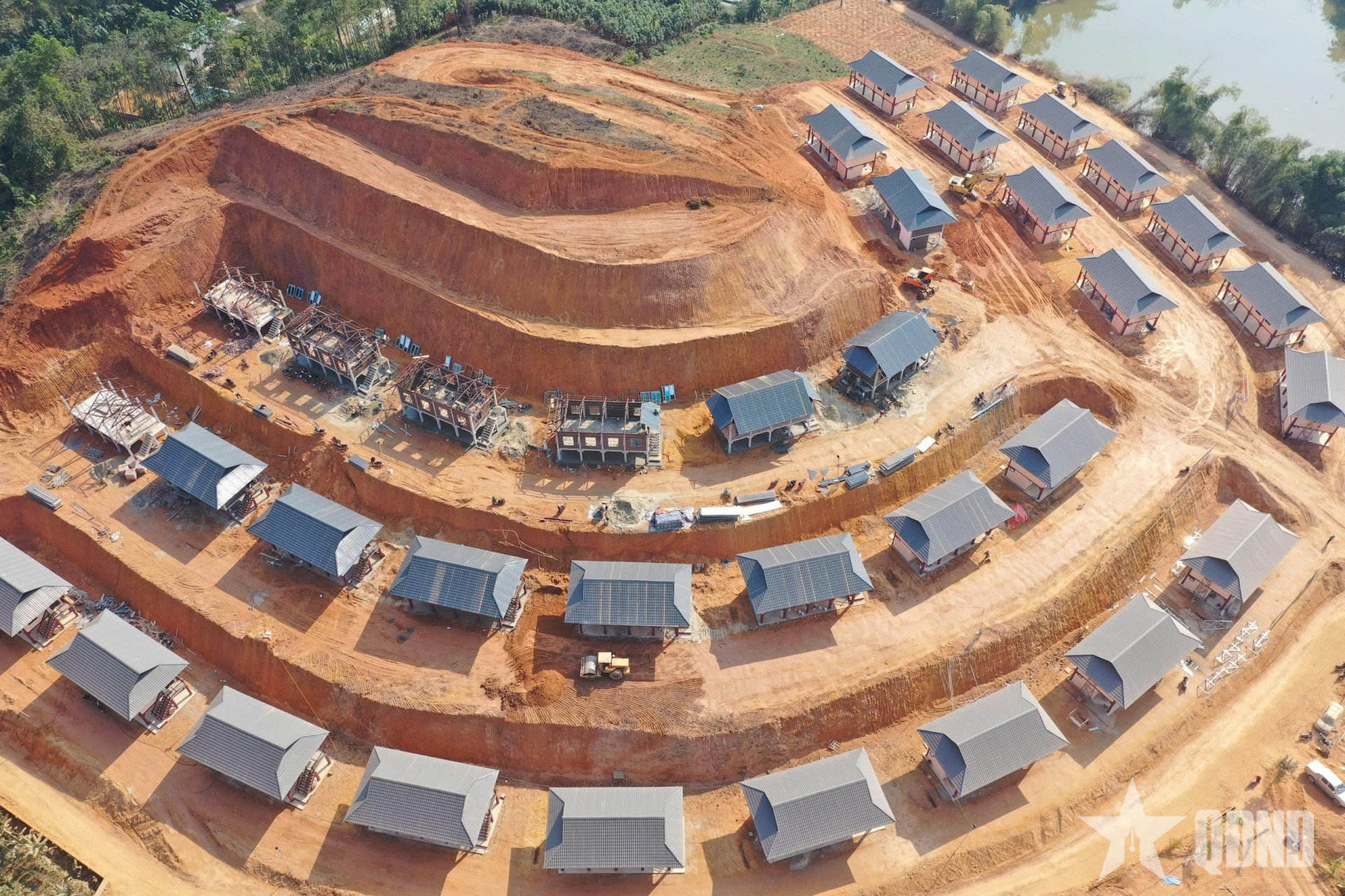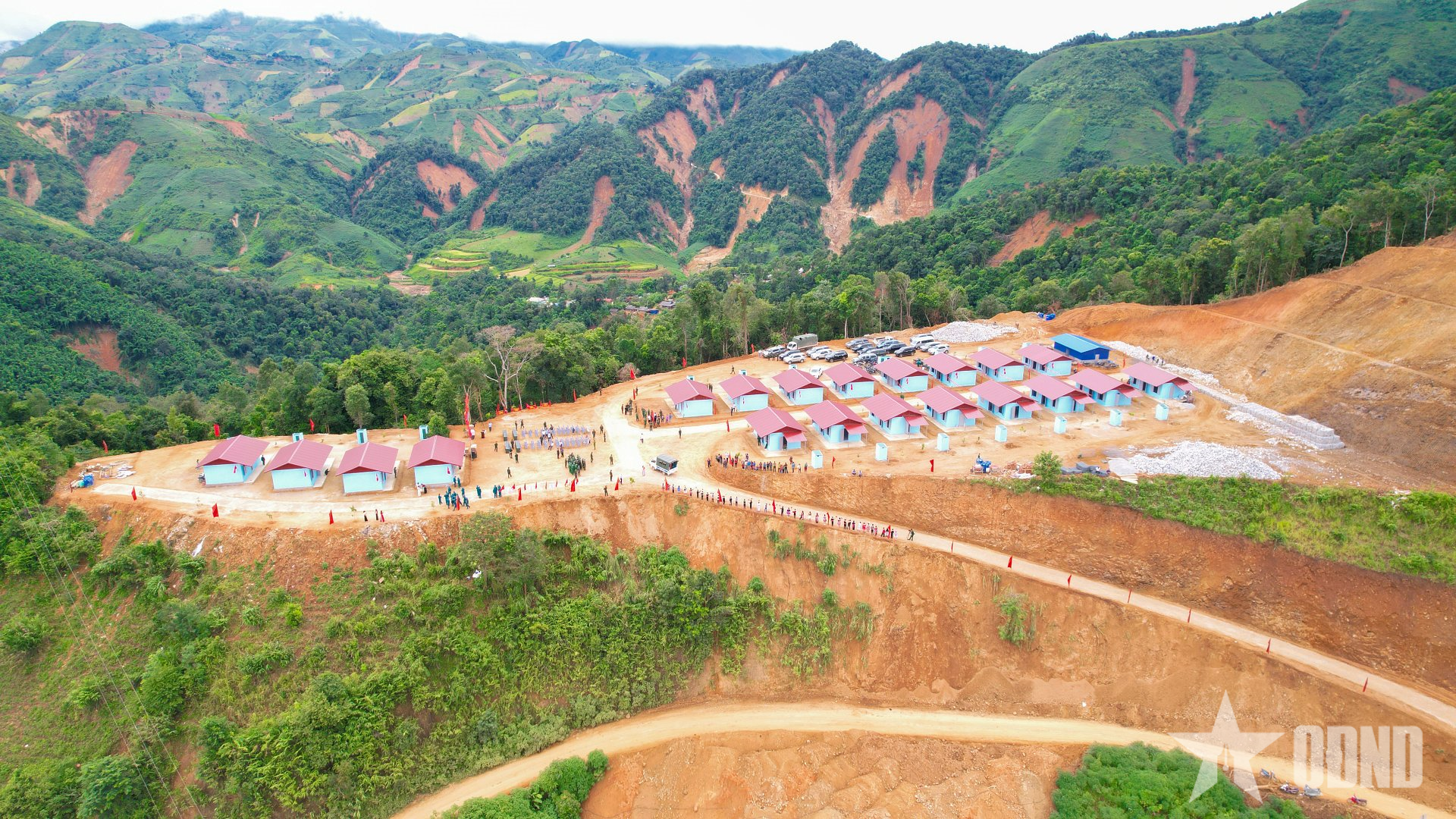 Với tình cảm, trách nhiệm và quyết tâm cao, chỉ sau 60 ngày, đêm thi công, các lực lượng đã tiến hành đào đắp, vận chuyển hơn 200.000m3 đất; xây dựng hệ thống hạ tầng kỹ thuật đồng bộ trên khu đất quy hoạch có diện tích 2,87 ha. Với kinh phí xây dựng 650 triệu đồng/nhà, toàn bộ 35 nhà sàn 2 tầng được xây dựng mới có diện tích sử dụng 132m2 với khung bê tông cốt thép, tường gạch, lợp tôn chống nóng, thiết kế theo đúng đặc trưng kiến trúc dân tộc Tày.