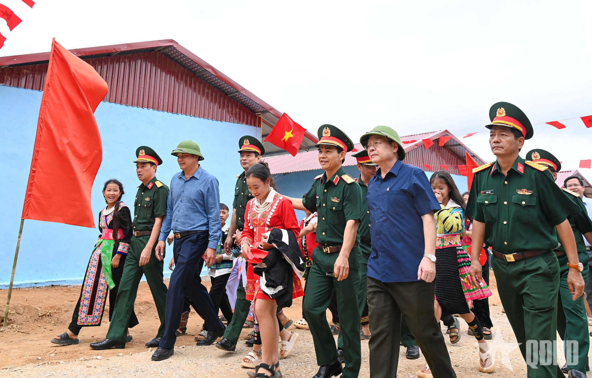 Thiếu tướng Nguyễn Văn Xuân, Phó tư lệnh Quân khu 2 cùng lãnh đạo tỉnh Điện Biên và Bộ CHQS tỉnh Điện Biên vui mừng tham quan 20 ngôi nhà mới tại khu tái định cư bản Háng Pu Xi trong ngày khánh thành, bàn giao.