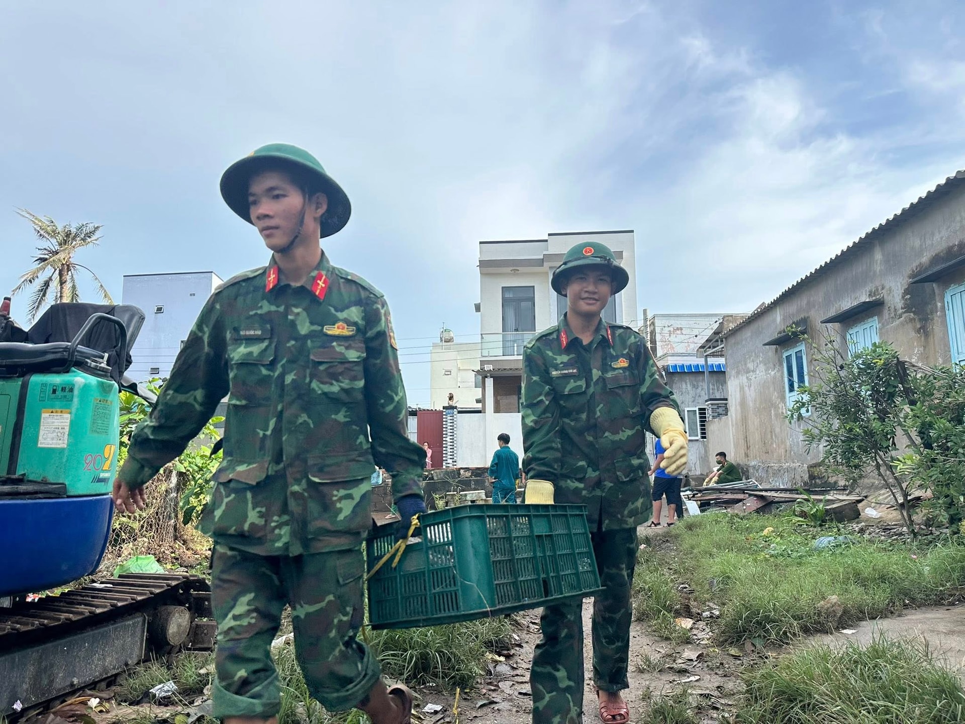 Cán bộ, chiến sĩ lực lượng vũ trang tham gia dọn vệ sinh ở Đặc khu Phú Quý