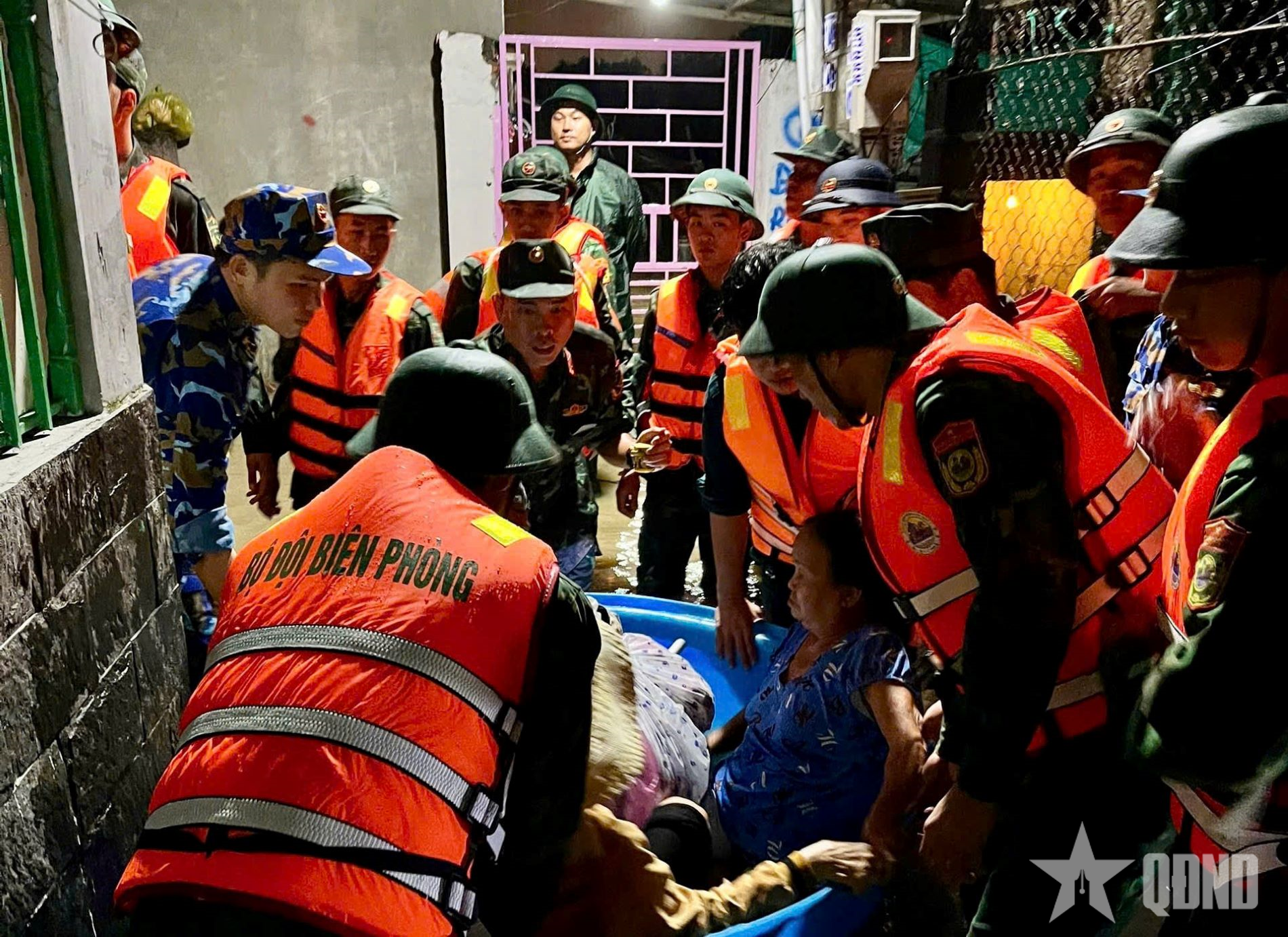 Bộ đội hỗ trợ người dân di dời đến nơi an toàn trong đêm.