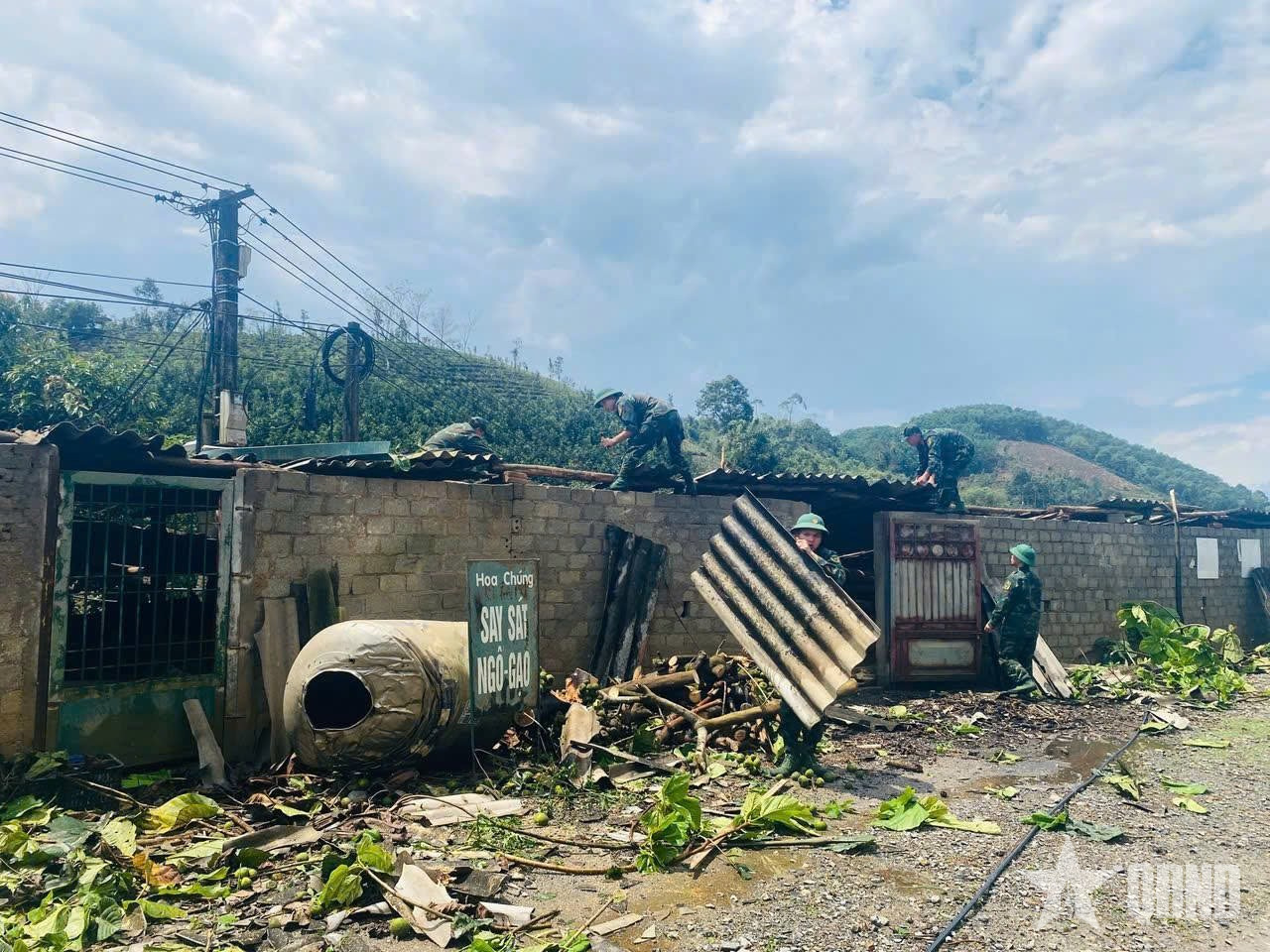 Cán bộ, chiến sĩ đồn Biên phòng Bản Lầu giúp đỡ hộ gia đình bị hư hỏng tốc mái dọn dẹp nhà cửa.
