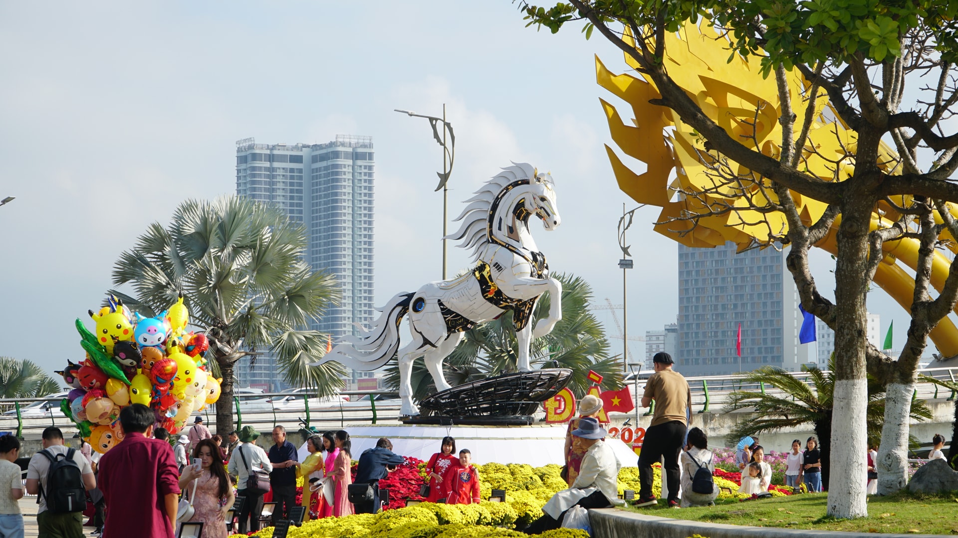 Ban ngày, Kim Mã 4.0 hiện lên nổi bật giữa nền trời trong xanh. Những đường nét tạo hình mạnh mẽ, sắc màu tươi sáng cùng không gian tiểu cảnh được bài trí hài hòa tạo nên tổng thể ấn tượng. Người dân nô nức đến tham quan, chụp ảnh, lưu giữ khoảnh khắc cuối năm bên linh vật của mùa xuân mới.
