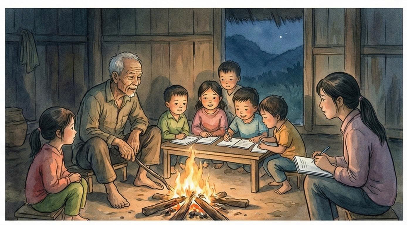 Cả lũ cười phá lên rồi cắm cúi đánh vần, tay bẩn lem mực nhưng ánh mắt sáng rực. Trong lúc bếp củi nổ lách tách, ông Xíu vừa chỉnh nét bút cho bé Pham, vừa nhắc bé Tý ngồi thẳng lưng. Có đứa mệt quá ngủ gục bên chân ông. Có đứa trốn học buổi sáng, nhưng vẫn chạy đến học buổi tối vì thích nghe ông kể chuyện về Bác Hồ.