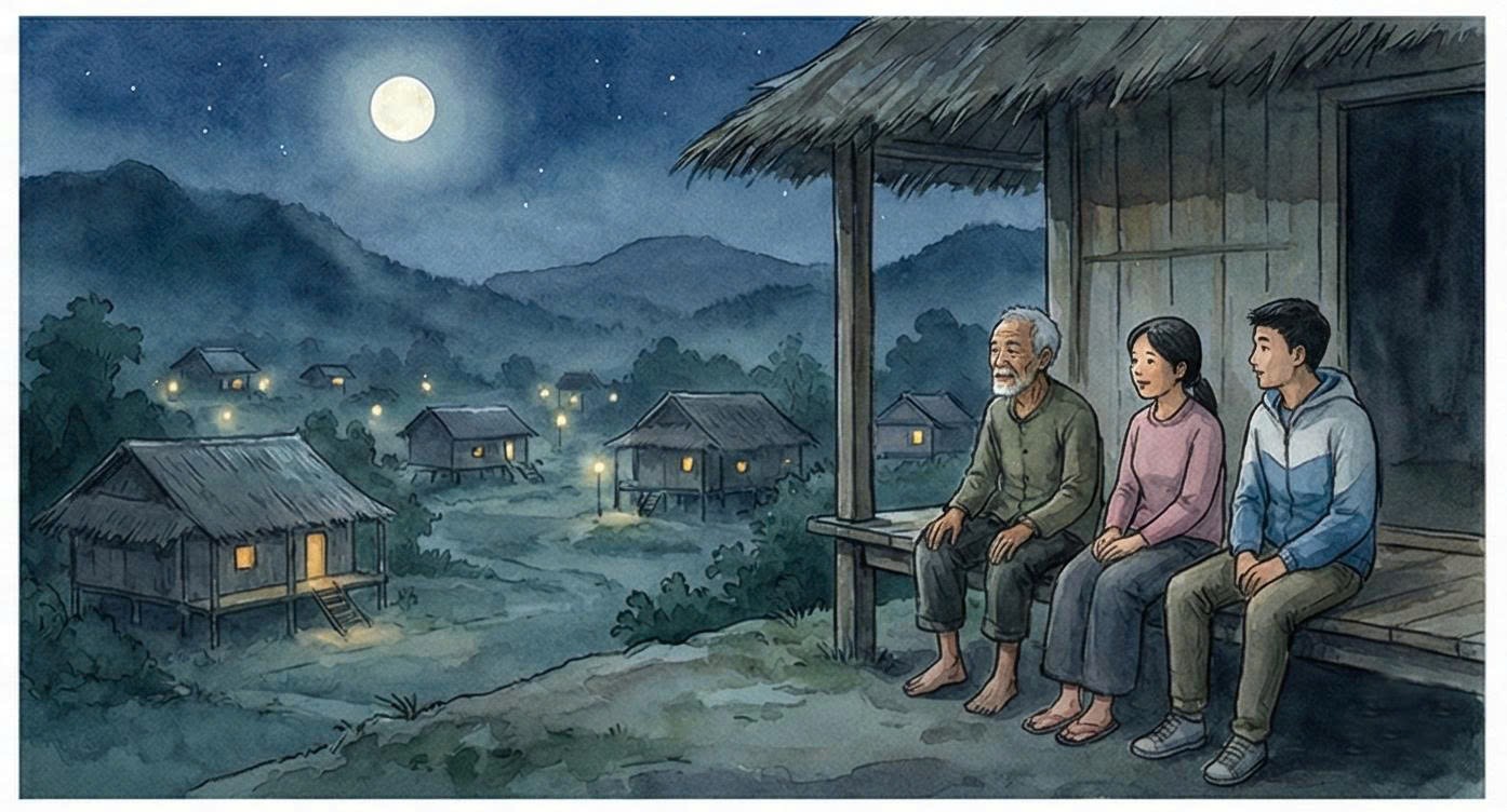 Cả lớp vỗ tay. Còn ông Xíu lặng lẽ mỉm cười. Đêm ấy, sau khi lớp học đầu tiên kết thúc, lũ trẻ đã về hết. Ông Xíu ngồi trước hiên, tay vẫn cầm cuốn sổ cũ. Bên cạnh là Minh và Hà. Trên cao, trăng lên tròn vành vạnh, bầu trời không một gợn mây. Ánh trăng đổ xuống sàn phơi, phủ lên mái nhà sàn một màu bạc nhẹ như khói, làm cho cảnh vật quen thuộc bỗng trở nên lặng lẽ và huyền ảo đến lạ thường. Gió núi thổi nhẹ. Lá tre xào xạc như tiếng người xưa trò chuyện. Hà khẽ nắm tay ông, thì thầm: