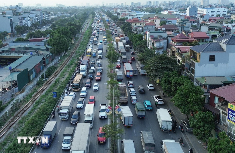 Ùn tắc cục bộ xảy ra tại điểm giao Thạch Bàn-Nguyễn Văn Linh theo cả 2 hướng. (Ảnh: Phan Phương/TTXVN)