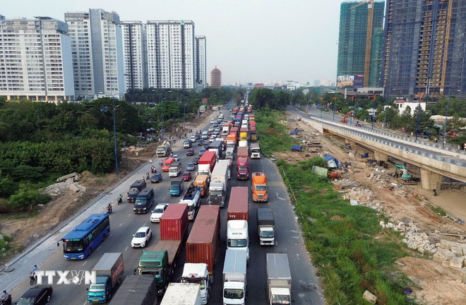Khu vực nút giao An Phú ở phía Đông của Thành phố Hồ Chí Minh khá đông phương tiện. (Ảnh: TTXVN phát)